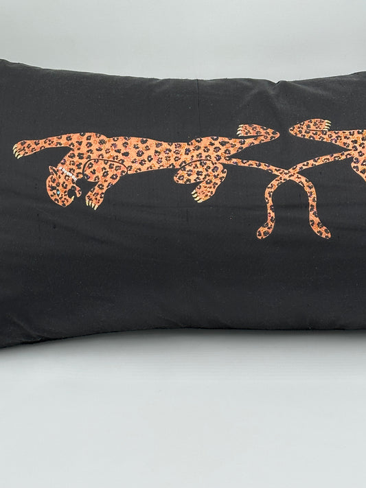 Hand Painted Black Dupioni Silk Lumbar Pillow with Leopards